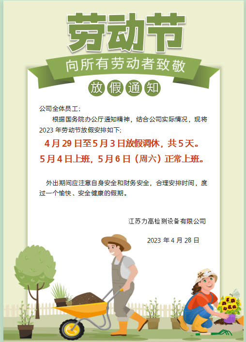 江蘇力高檢測(cè)設(shè)備有限公司五一勞動(dòng)節(jié)放假通知